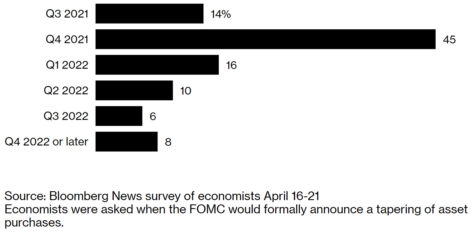 يعتبر هذا أبكر قليلاً مما كان متوقعاً في استطلاع مارس، ولكنه يترك مشتريات الأصول الفيدرالية دون تغيير لعدة أشهر أخرى، مع عدم توقع الزيادة الأولى في سعر الفائدة حتى عام 2023.