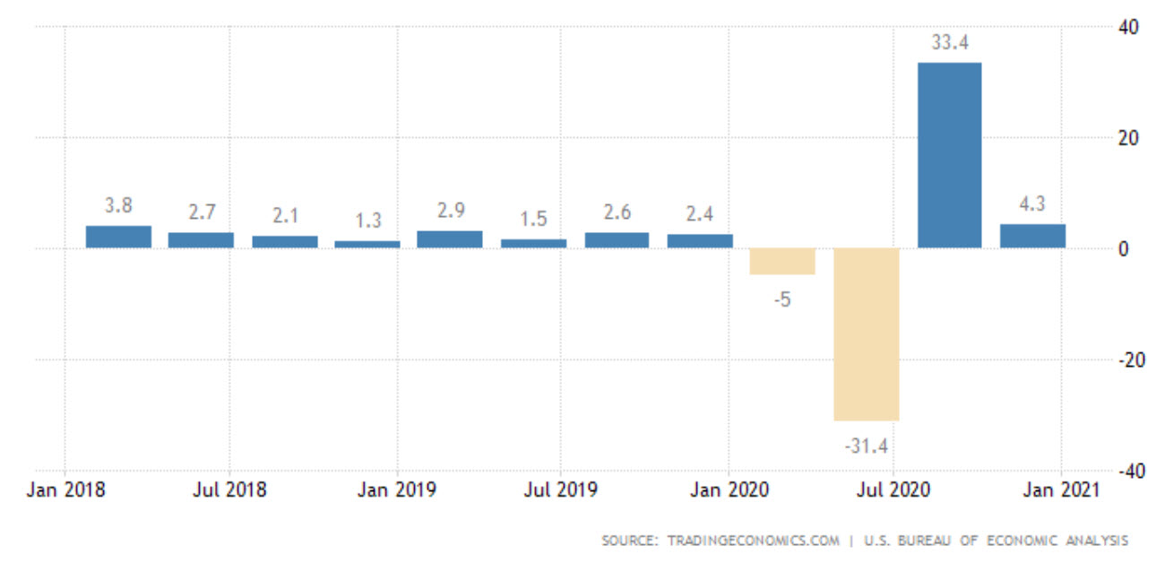 توسع الاقتصاد الأمريكي بمعدل سنوي يبلغ 4.3٪ على أساس ربع سنوي في الربع الرابع من عام 2020، وهذا كان أعلى من 4.1٪ في التقدير الثاني.
