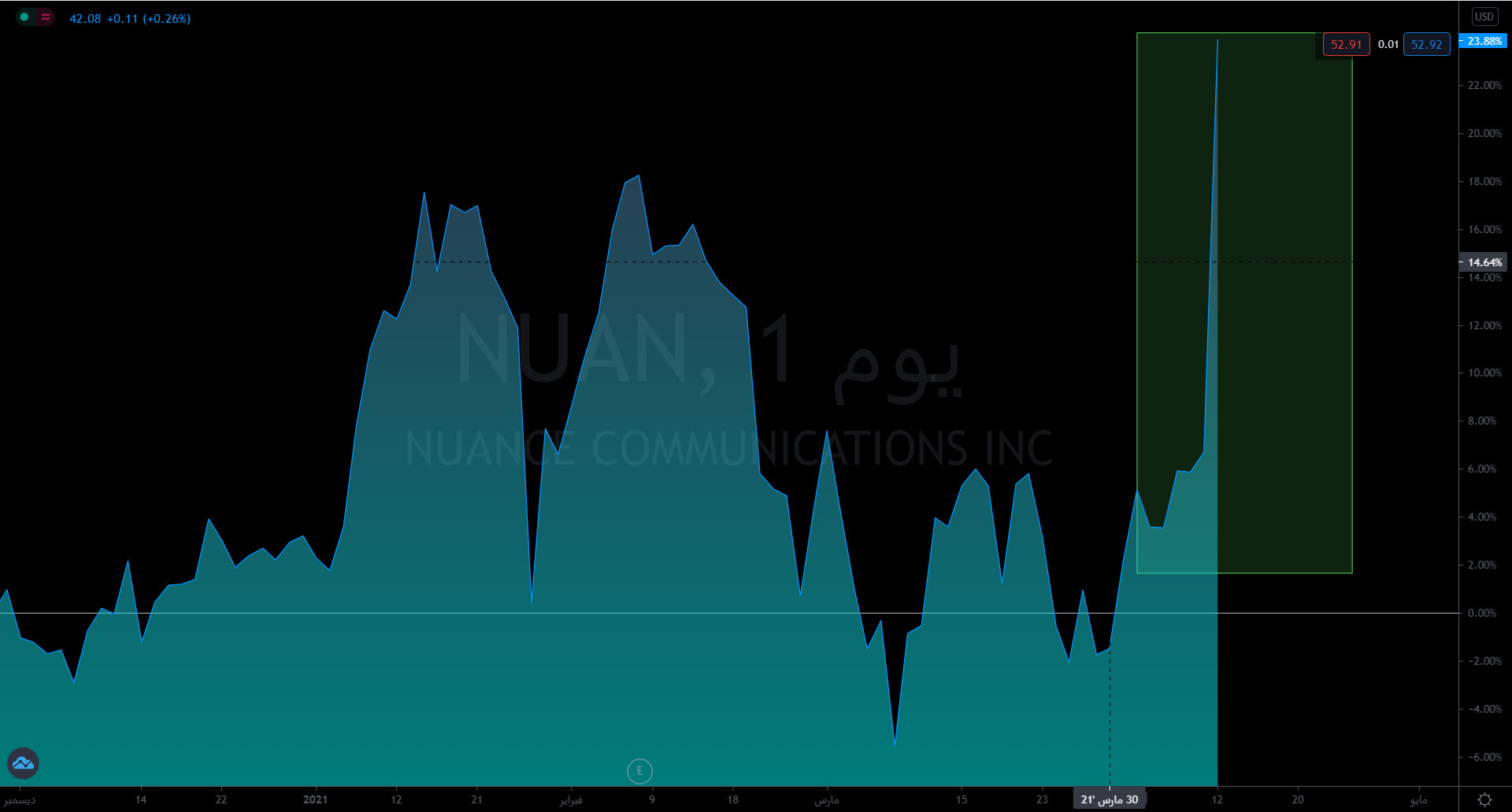 منذ يوم الجمعة ارتفعت أسهم “نوانس” بنسبة 3.4٪ أما بعد موافقة “مايكروسفت” على صفقة الاستحواذ يوم أمس الإثنين، فقد ارتفع السهم بنسبة أكثر من 17٪.