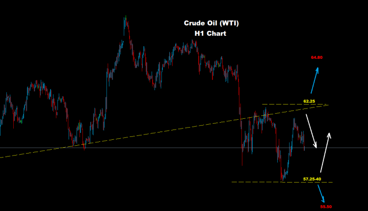 فإن النفط الخام قد نجح بالحفاظ على تداولاته بين مستويات الدعم 40-57.25 ومستويات المقاومة 61.50-62.25