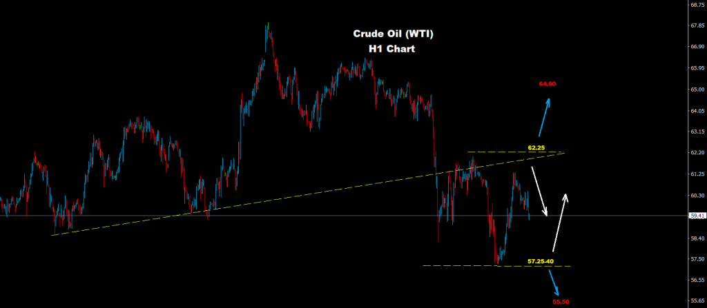 فإن النفط الخام قد نجح بالحفاظ على تداولاته بين مستويات الدعم 40-57.25 ومستويات المقاومة 61.50-62.25