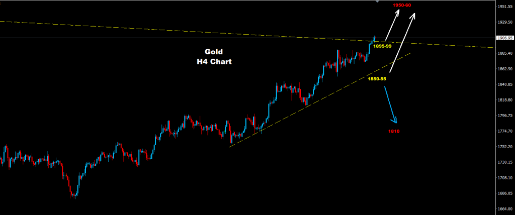 نجح المعدن الثمين باختراق حواجز مقاومة 05-1900 حيث أشرنا له يوم أمس إنه وفوق هذه المستويات فإن موجة صعود جديدة قد تسيطر على السوق.