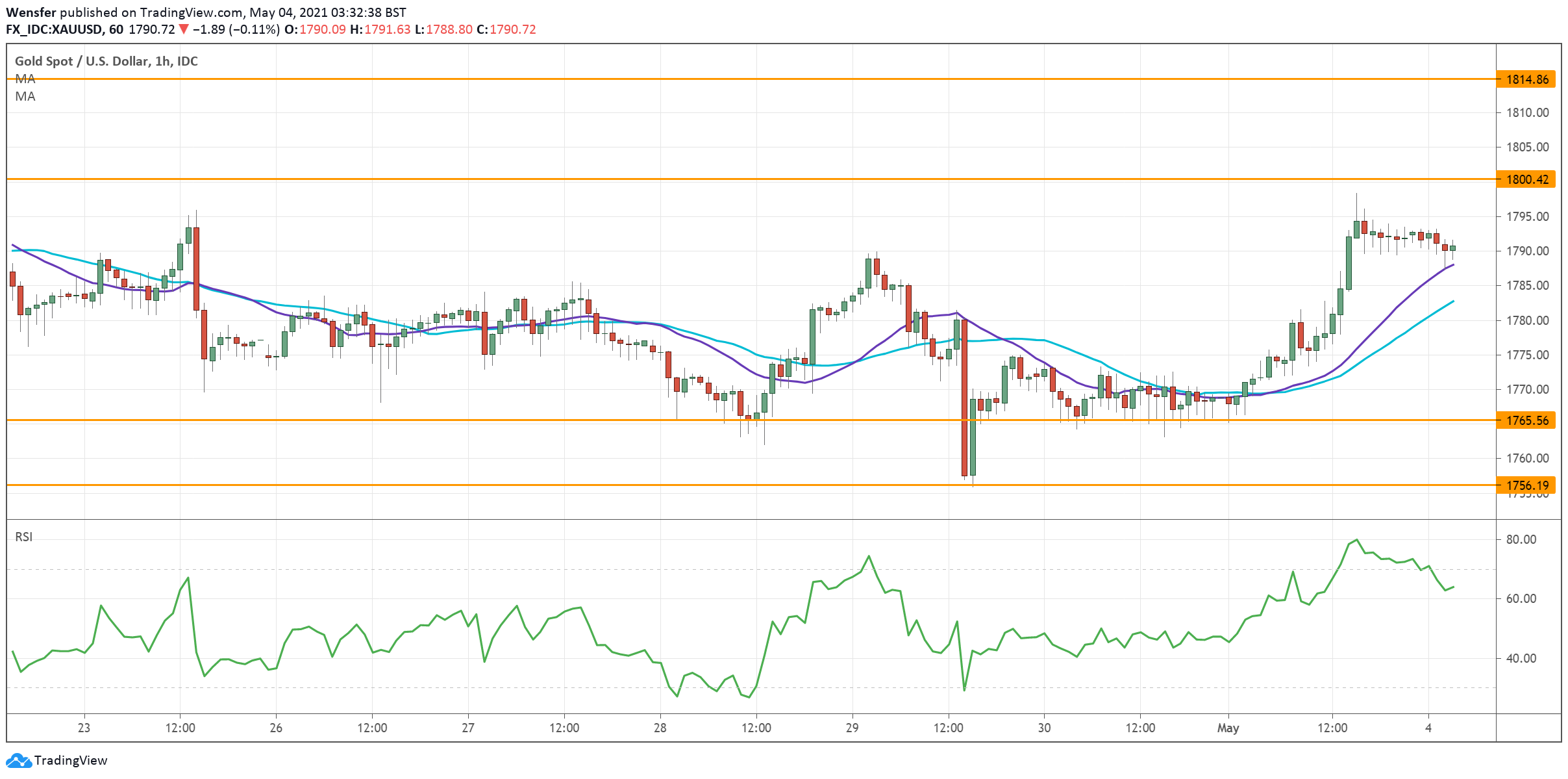 وجد الذهب عروضاً بعد أن صرحت جمعية الذهب الصينية بإن استهلاك البلاد من الذهب قد ارتفع بنسبة ٩٣.٩٪ على أساس سنوي في الربع الأول. وكانت حركة السعر قد تعرضت لضغوط بيع حول المستوى النفسي ١٨٠٠، أي بالقرب من منطقة العرض من نقطة البيع في فبراير الماضي عند ١٨١٥.