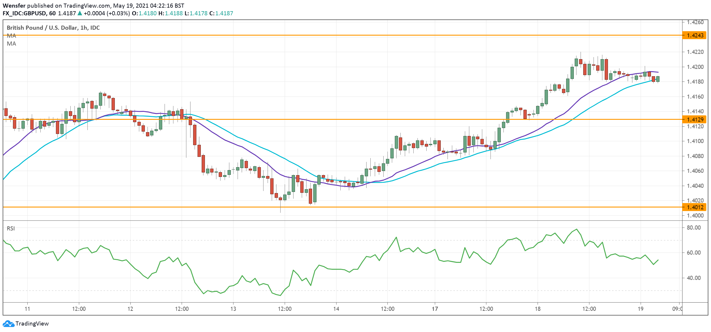 وفي الوقت الراهن، هناك خطر محدود على الجانب السلبي حيث أن مؤشر القوة النسبية في ذروة الشراء داخل منطقة العرض هذه قد تؤدي إلى عمليات جني الأرباح. ويعد المستوى ١.٤١٣٠ هو الدعم المباشر في حالة حدوث ذلك.