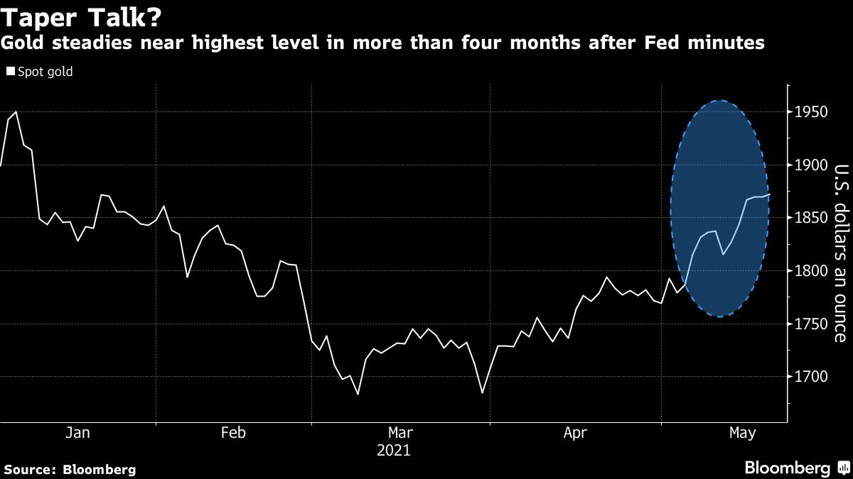 استقر الذهب بالقرب من أعلى مستوى في أكثر من أربعة أشهر حيث قام المستثمرون بتقييم محضر اجتماع مجلس الاحتياطي الفيدرالي في أبريل والذي أشار إلى إمكانية النقاش حول تقليص مشتريات الأصول.