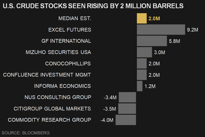 بينما تترقب الأسواق بوقت لاحق اليوم الأربعاء مخزونات الخام الأمريكية، وتشير التوقعات بارتفاع بمقدار مليوني برميل الأسبوع الماضي، حيث إذا تم تأكيده من وكالة الطاقة الأمريكية فسيكون ذلك أول مكسب في ثلاثة أسابيع.