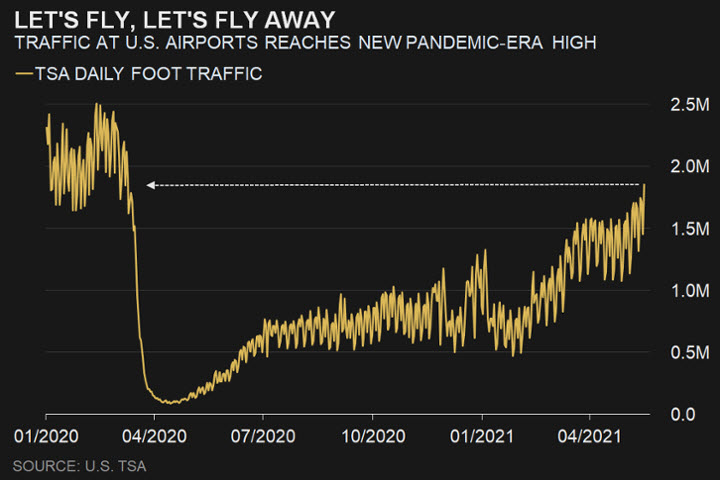 كما شهدت المطارات الأمريكية ازدحاماً أكبر منذ بدء الوباء، وهي أقوى علامة حتى الآن على انتعاش السفر المحلي الذي يقود الطريق في عودة وقود الطائرات هذا الصيف.