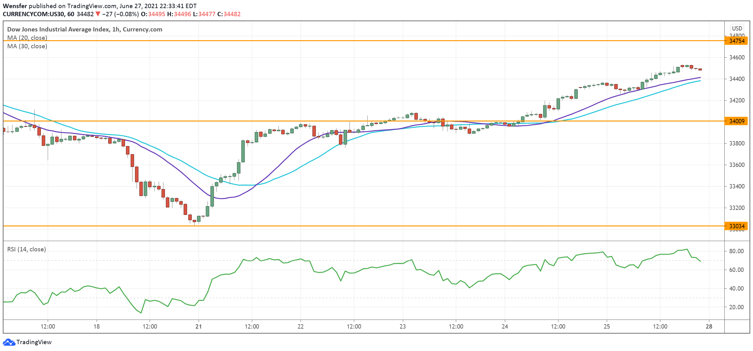 ويبدو أن متداولي الزخم غير منزعجين من مؤشر القوة النسبية المتواجد في منطقة ذروة الشراء حتى اللحظة. ويتجه المؤشر صوب المستوى ٣٤٧٥٠، وهي منطقة العرض من عمليات البيع السابقة. وسيفتح الاختراق الإيجابي الباب أمام القمة الواقعة عند ٣٤٨٥٠.