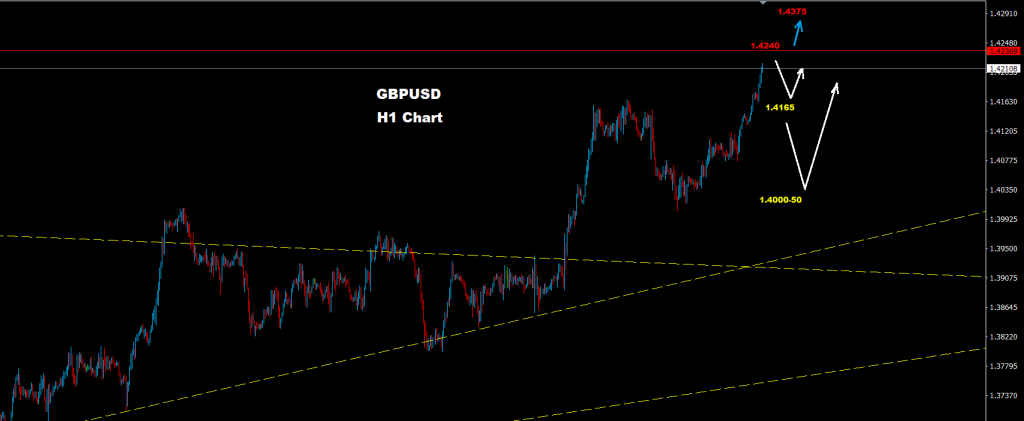 فوق 1.4240، فإننا سنرى مزيداً من التقدم نحو 1.4375 وقد يصطدم السوق بحواجز 1.4500