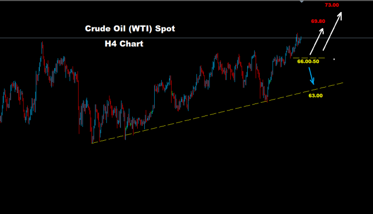 نجح النفط الخام باختراق مستويات المقاومة الرئيسية لمستويات 68.00 حيث أشرنا سابقاً إنه وفوق هذه المستويات، فإن موجة صعود جديدة قد تسيطر على السوق.