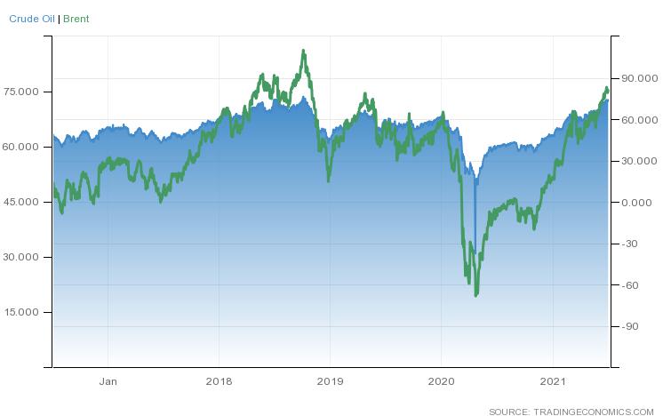 ووصل كلا الخامين القياسيين هذا الأسبوع الماضي إلى أعلى مستوياته منذ أكتوبر 2018، وذلك وسط انخفاض المخزونات والتفاؤل بشأن تعافي الطلب على الوقود هذا الصيف.