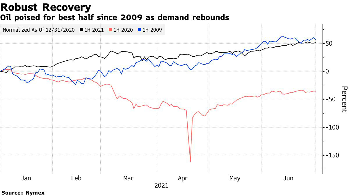 يتجه النفط إلى أفضل أداء نصف سنوي منذ عام 2009 حيث إن الانتعاش من الوباء يعزز استهلاك الوقود ويقلص السوق قبل اجتماع “أوبك+” الرئيسي الذي من المتوقع أن يؤدي إلى زيادة في المعروض.