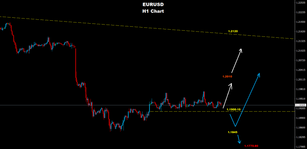 تحت 1.1910، فإن مزيداً من الهبوط سيكون متوقعاً على السوق مع دعم آخر حول 1.1845 والذي قد يحمي موجة التصحيح المتقدمة هذه نحو 1.2010