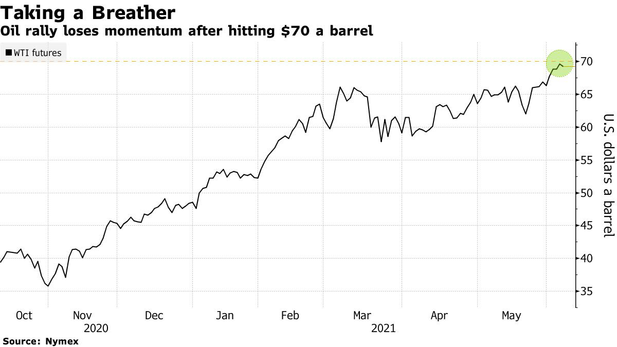 مما أدى لفقدان الأسعار بعض الزخم بعد أن بلغت 70 دولاراً للبرميل في نيويورك للمرة الأولى منذ أكثر من عامين.