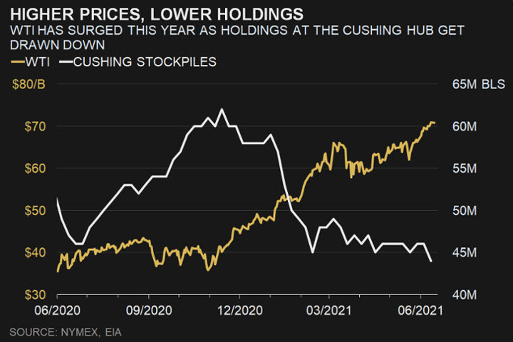 قد شهد المستهلكون الرئيسيون بما في ذلك الولايات المتحدة والصين انتعاشاً قوياً من جائحة كورونا مما أدى إلى زيادة الطلب على الوقود والمساعدة في استنزاف المخزونات المتضخمة التي تراكمت خلال الوباء.