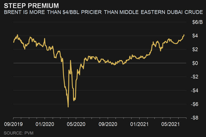 يعد خام برنت هو الأغلى مقابل نفط الشرق الأوسط في 21 شهراً، حيث يكتسب انتعاش الطلب بقيادة الولايات المتحدة وأوروبا زخماً.