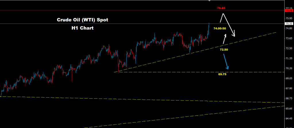 تمكن النفط الخام من الحفاظ على مسيرة الارتفاع ضمن توقعات المدى القصير حيث يقترب السوق من مستوى المقاومة الرئيسي 76.85