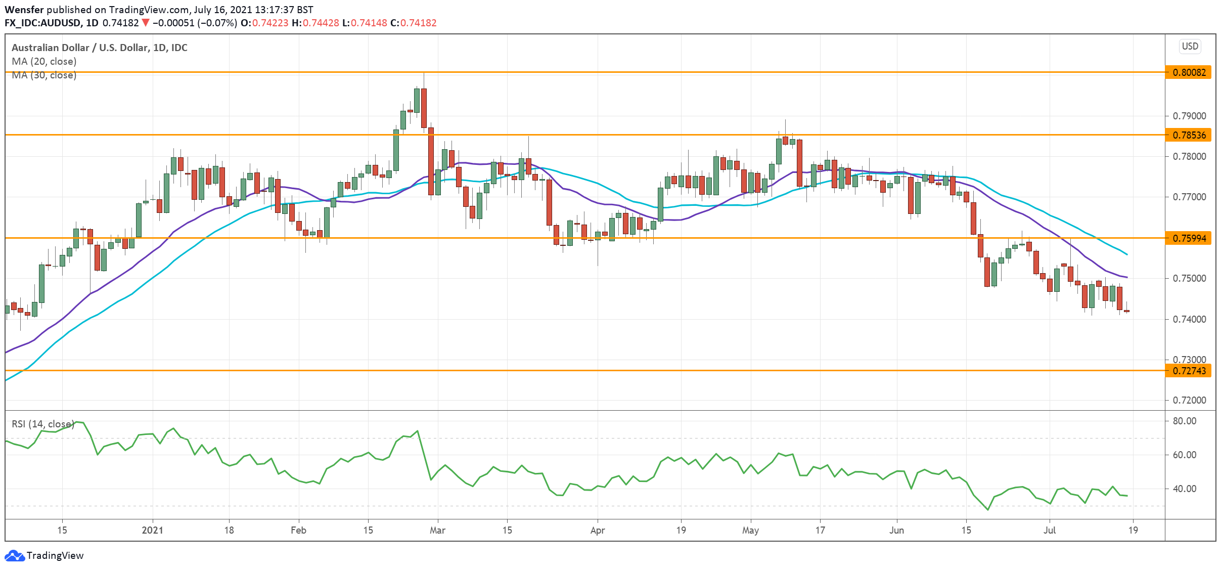 يتراجع الدولار الأسترالي بسبب الإغلاق الجديد في ملبورن والذي يشكل تهديداً للتعافي الاقتصادي. فإلى جانب إغلاق سيدني، ستكلف القيود المفروضة على المركزين الاقتصاديين في البلاد أكثر من مليار دولار أسترالي كل أسبوع.