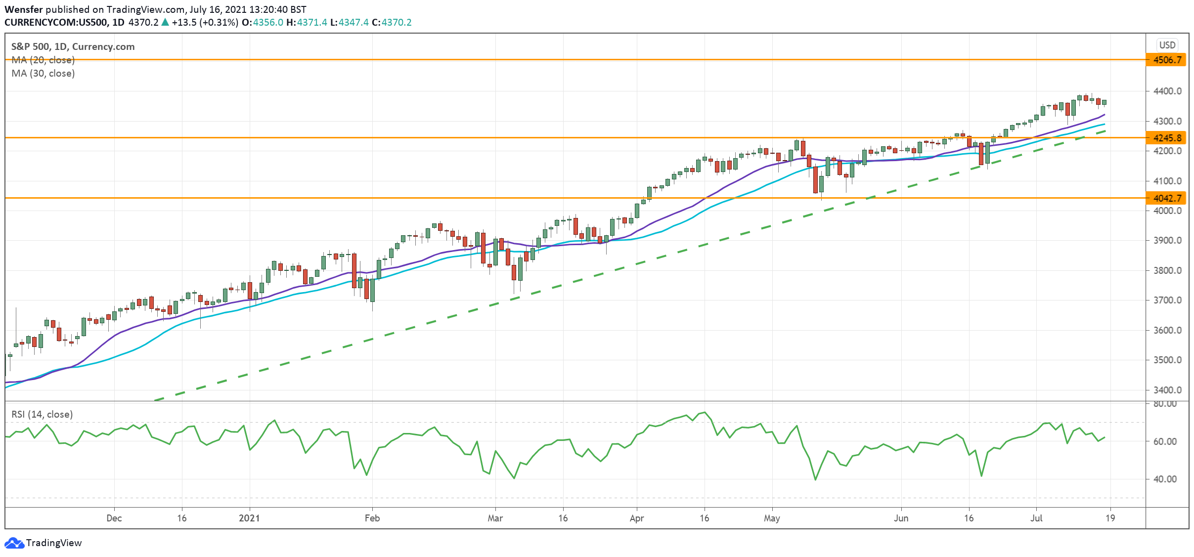 وقد يستمر زخم الصعود منحياً هؤلاء المراهنين على كون أن الارتفاع مجرد فقاعة جانباً لفترة من الوقت. وسيكون المستوى ٤٥٠٠ هو الهدف التالي، فيما سيكون المستوى ٤٢٤٥ هو مستوى الدعم الأول في حالة التراجع.