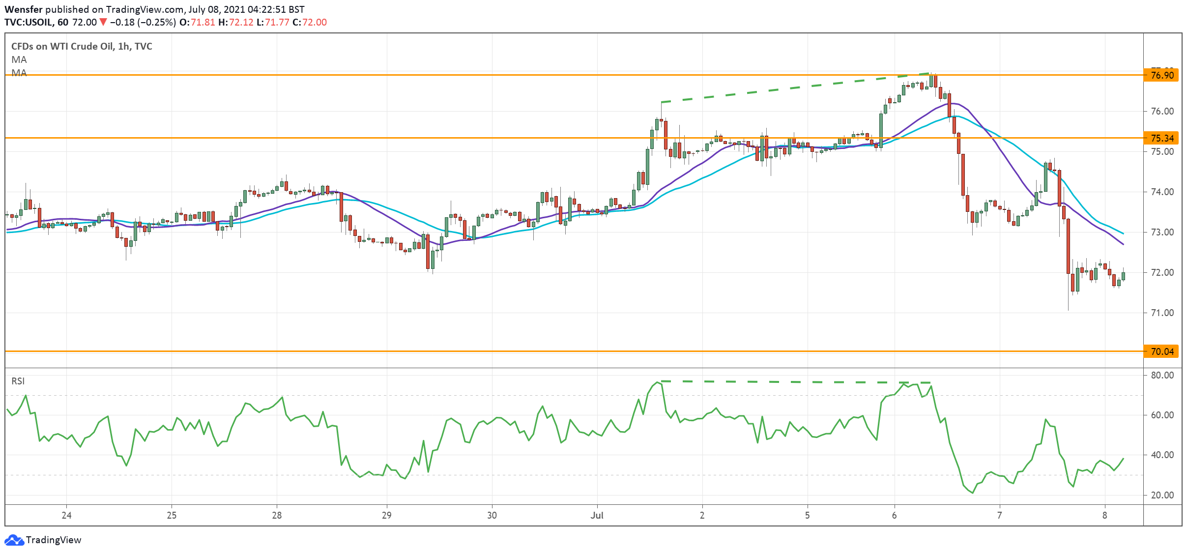 ويدفع البائعون بالحركة صوب المستوى النفسي ٧٠.٠٠. وأدنى ذلك المستوى، سيكون خط الاتجاه الصاعد عند المستوى ٦٨.٤٠ من شهر أبريل لعام ٢٠٢٠ بمثابة دعم حاسم. أما المستوى ٧٥.٣٠ فيمثل مستوى المقاومة حالياً في حالة حدوث ارتداد.