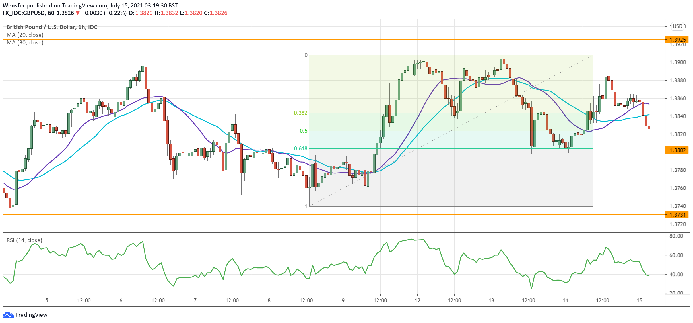 وقد شهدت حركة السعر دعماً قوياً أعلى المستوى ١.٣٧٣٠، وهي منطقة طلب مهمة على الرسم البياني اليومي. وفي أعقاب الارتفاع الأولي، ارتد الزوج عن مستوى تصحيح فيبوناتشي ٦١.٨٪ الواقع عند المستوى ١.٣٨٠٠، في حين تعافى مؤشر القوة النسبية عائداً إلى المنطقة المحايدة.