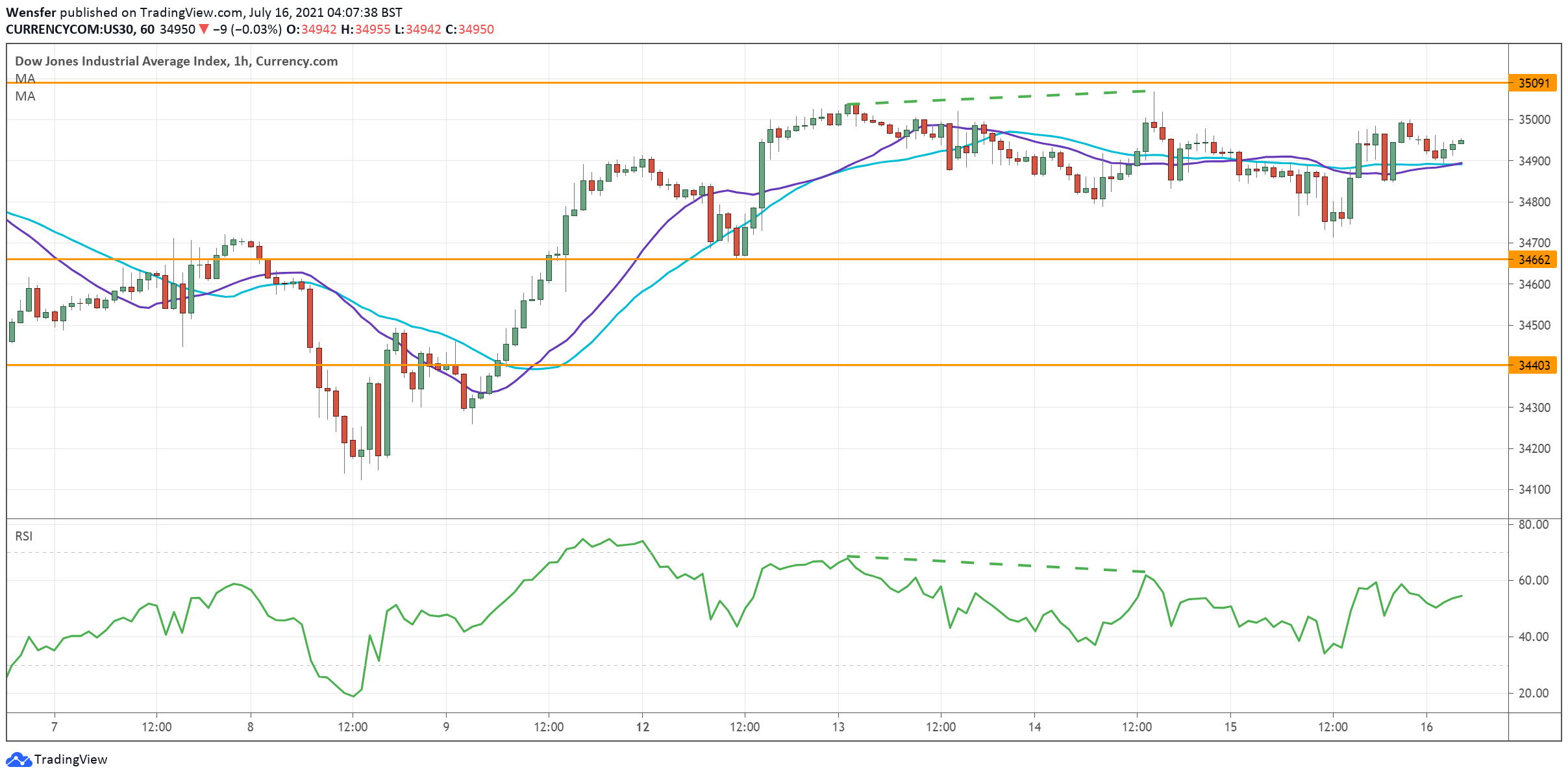 يتوطد مؤشر الداو جونز مع تأكيد رئيس بنك الاحتياطي الفيدرالي “جيروم باول” من جديد على الطبيعة المؤقتة للتضخم. وقد توقف الارتفاع عند أعلى مستوى كان قد سجله في مايو عند ٣٥٠٩٠.