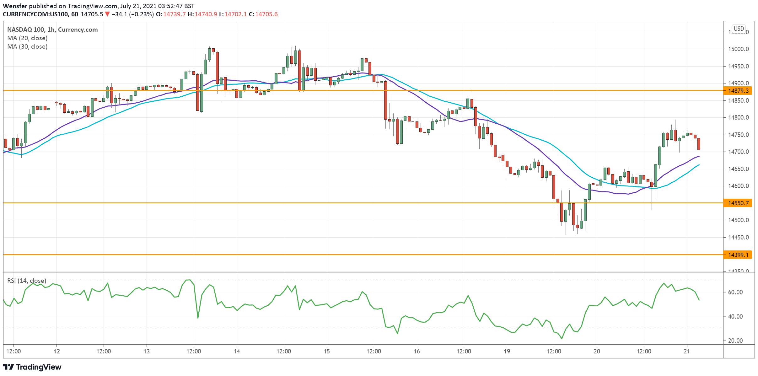 يسعى مؤشر ناسداك لإيجاد الدعم فيما يتزايد قلق المستثمرين من عمليات البيع المكثفة في أسهم دلتا. وقد أدى الاختراق السلبي ما دون مستوى الدعم الرئيسي قصير الأجل عند ١٤٥٥٠ إلى وضع المشترين تحت الضغط.