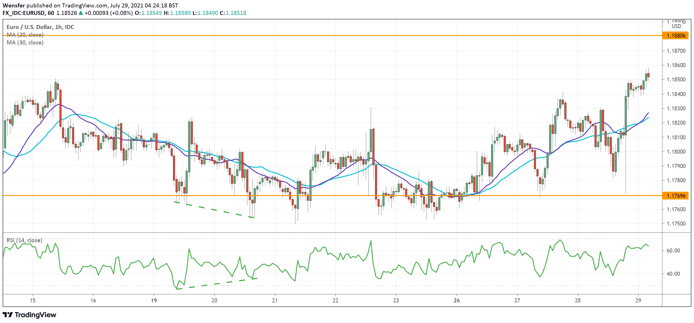 ومن المرجح أن يكون المستوى ١.١٨٨٠ هو العقبة الأخيرة والتي من شأن تجاوزها أن يؤدي إلى تسارع وتيرة الارتفاع. أما المستوى ١.١٧٧٠ فيمثل مستوى الدعم الجديد في حال تراجع الزوج.