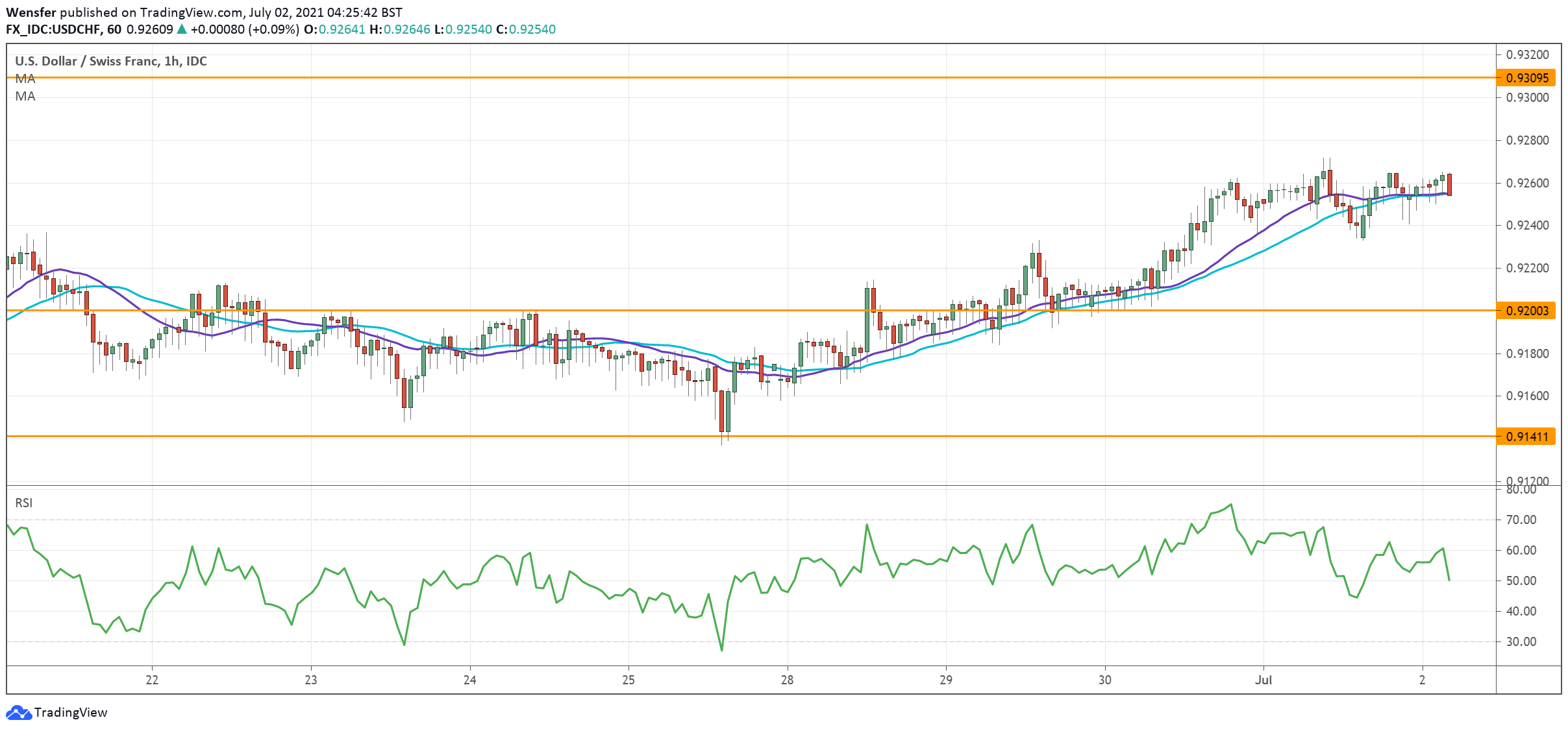 هذا وقد عاد مؤشر القوة النسبية إلى المنطقة المحايدة. ومن المرجح أن يقدم أتباع الاتجاه الدعم مع تراجع السعر. أما المستوى ٠.٩٢٠٠، والذي يمثل قاعدة الارتفاع فهو خط الدفاع الأول.