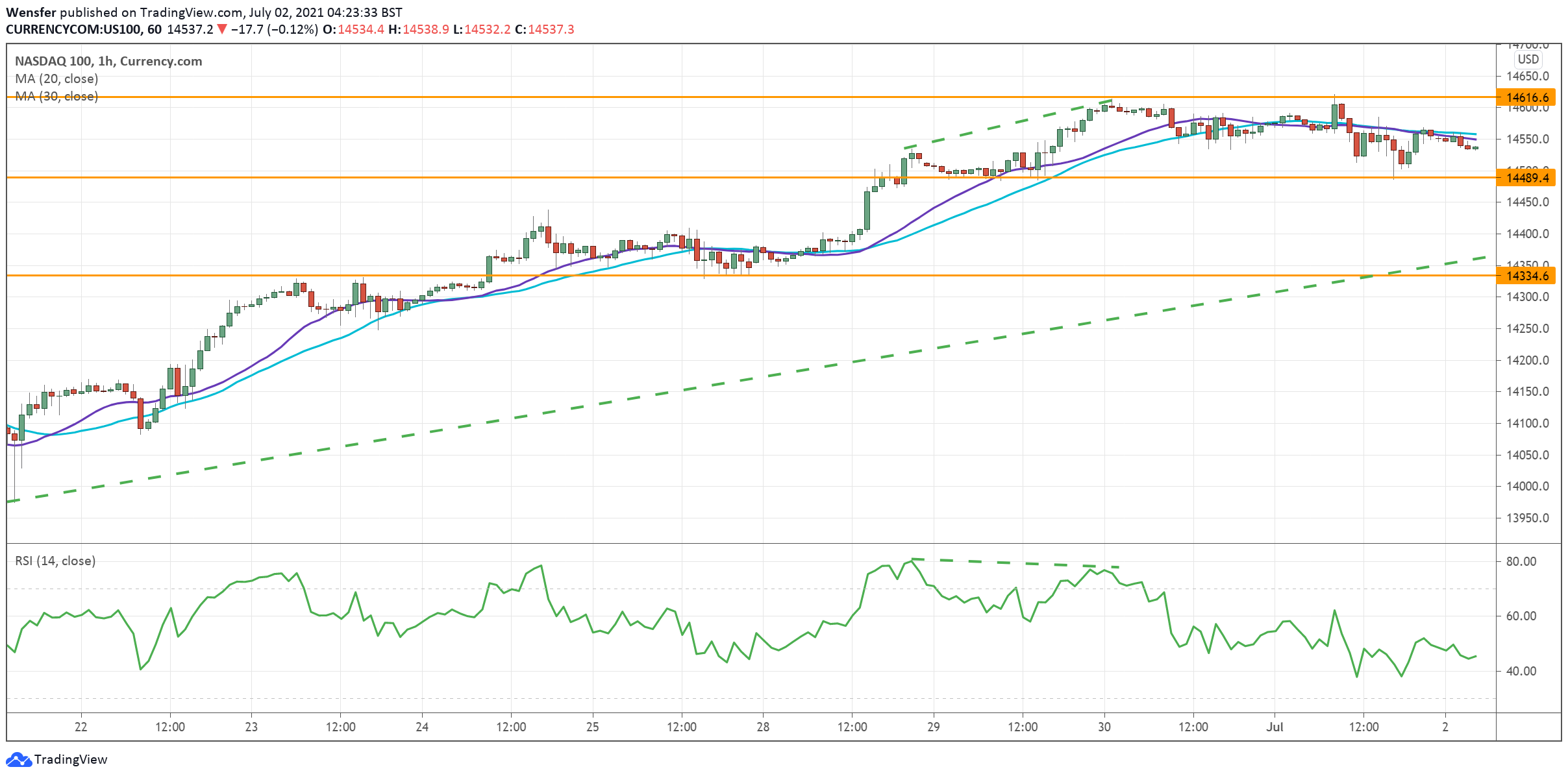 وقد اكتسب الارتفاع زخماً بعد أن اخترق أعلى مستوى له في أبريل عند ١٤٠٧٠. وقد دفع الزخم المؤشر أعلى خط الاتجاه الصاعد والذي تم تأسيسه في أواخر مايو.
