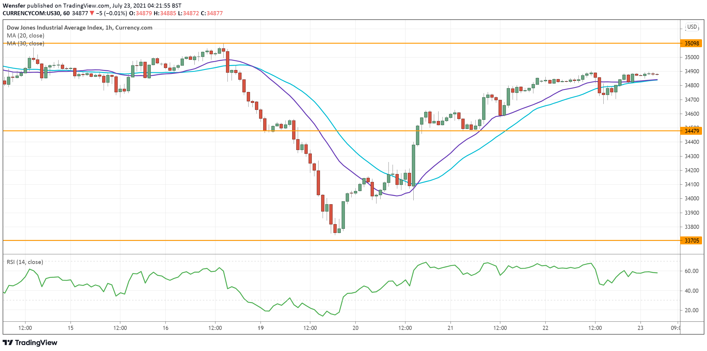 وفي هذه الاثناء، قد يخفف وجود مؤشر القوة النسبية بالقرب من مستوى ذروة الشراء من الحماس. كما أن التراجع صوب مستوى الدعم الجديد عند ٣٤٤٨٠، قد يشكل فرصة شراء.