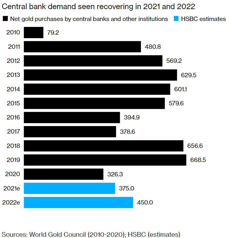 تقديرات مجلس الذهب العالمي وبنك HSBC يظهر تفاؤلاً بارتفاع احتياطات الذهب خلال 2021 و 2022