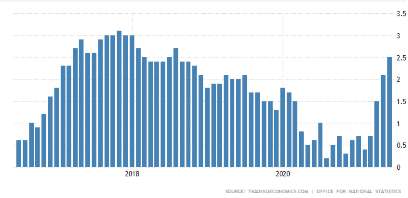 ارتفع معدل التضخم السنوي في المملكة المتحدة بشكل مفاجئ إلى 2.5٪ في يونيو 2021 من 2.1٪ في مايو، وهذا أعلى من توقعات السوق البالغة 2.2٪. حيث إنه أعلى معدل تضخم منذ أغسطس 2018.