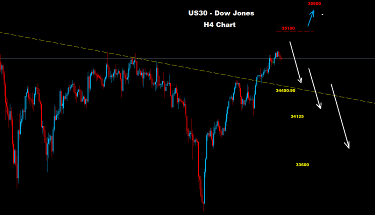 يواجه السوق الآن المقاومة القديمة 35100 بينما تقع منطقة مقاومة السوق عند 34950-35100 والتي إذا استمر السوق في التداول تحتها فان فرصة لموجة هابطة تصحيحيه أخرى قد تضرب السوق نحو مستويات الدعم عند 34350 و 34100 و 33600