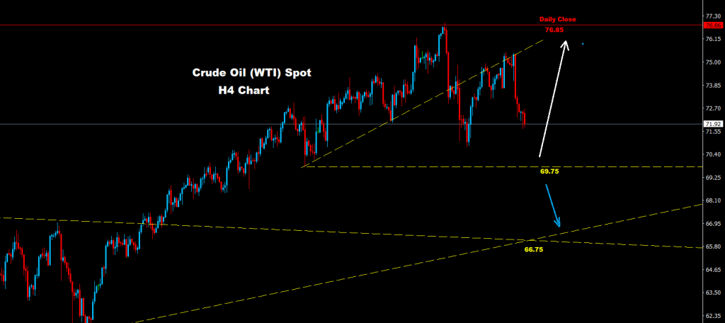 كما اشرنا له سابقاً تمكن النفط الخام من الحفاظ على التداولات تحت المقاومة 76.85 حيث كان التصحيح الهبوطي متوقعاً نحو 71.00 و 70.00