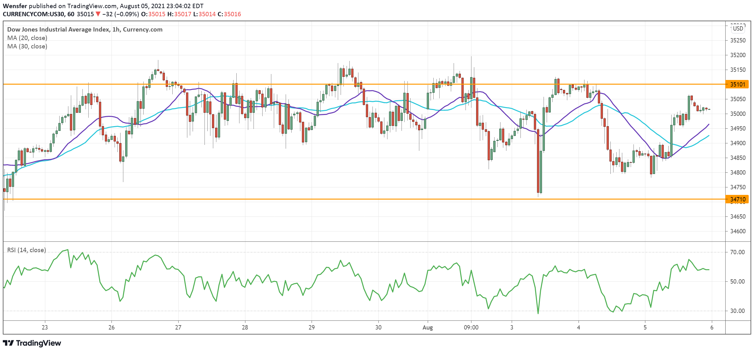 وقد يؤدي الإغلاق أعلى المستوى ٣٥١٠٠ بتوجه المؤشر صوب المستوى ٣٥٥٠٠. بيد أن الانخفاض إلى ما دون الدعم المذكور قد يتسبب في حصول عمليات بيع تستهدف مستوى الدعم اليومي عند ٣٤٠٠٠
