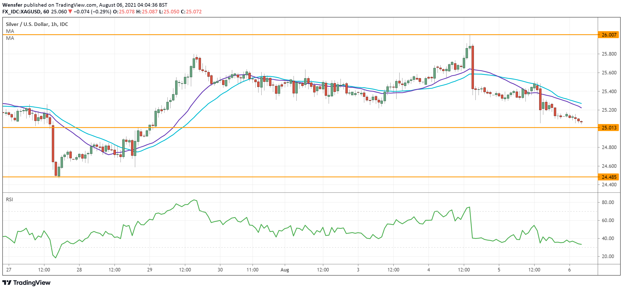 وقد يجدد وجود مؤشر القوة النسبية في منطقة ذروة البيع رغبة المشترين بتداول الانخفاض. وإلا فإن الاتجاه الهابط سينهي حركة الارتداد الأخيرة وقد يكون المعدن عرضة لجولة جديدة من عمليات البيع المكثفة.