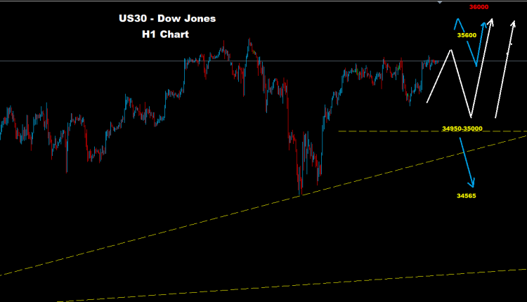 كما نرى على الرسم البياني، يواجه مؤشر الداو الآن منطقة تداول محتملة بين مستويات الدعم 34950-35200 ومنطقة المقاومة 800-35600