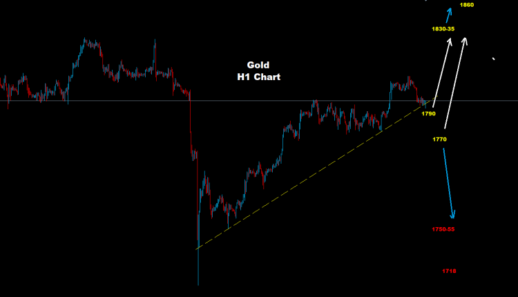 كما نرى على الرسم البياني اليومي، يواجه الذهب الدعم حول 1790 و 1770 حيث طالما استمر السوق في الاحتفاظ بالتداولات فوق أحد تلك المستويات، لا يزال من المتوقع حدوث تقدم نحو منطقة 35-1830