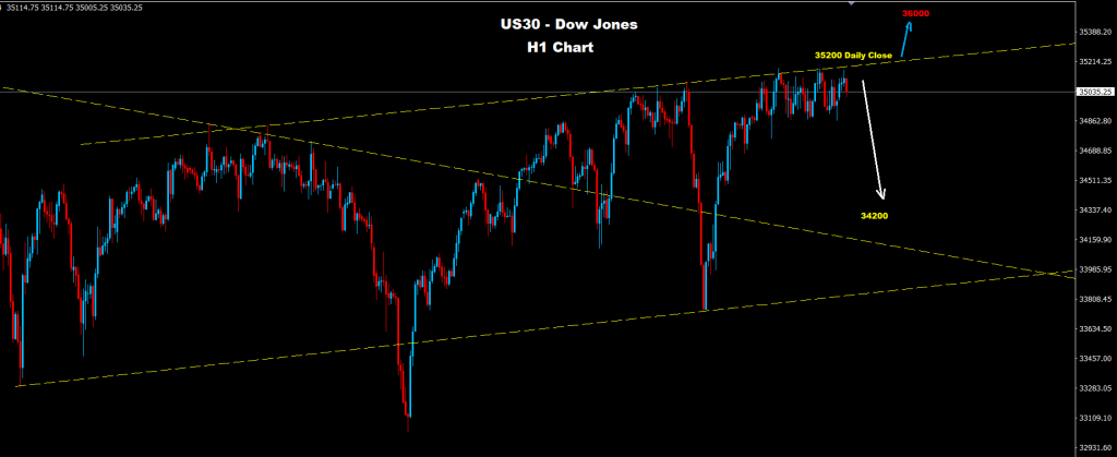 لا يزال مؤشر داو جونز يحتفظ بتداولاته دون مستويات المقاومة لقناة الاتجاه الصعودي حيث من المتوقع أن تضرب السوق موجة هبوط أخرى نحو 34200 طالما استمر السوق في الإغلاق اليومي دون 35200