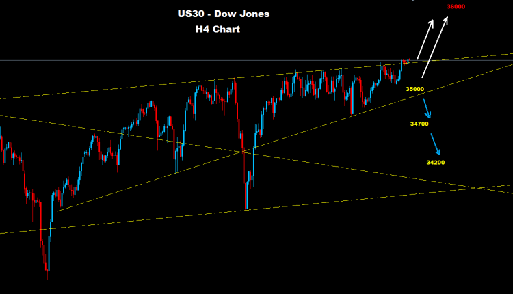 تمكن مؤشر الداو من الحفاظ على التداولات فوق مستوى الدعم 35000 حيث تمكن من تحقيق الهدف الأول حول 35600