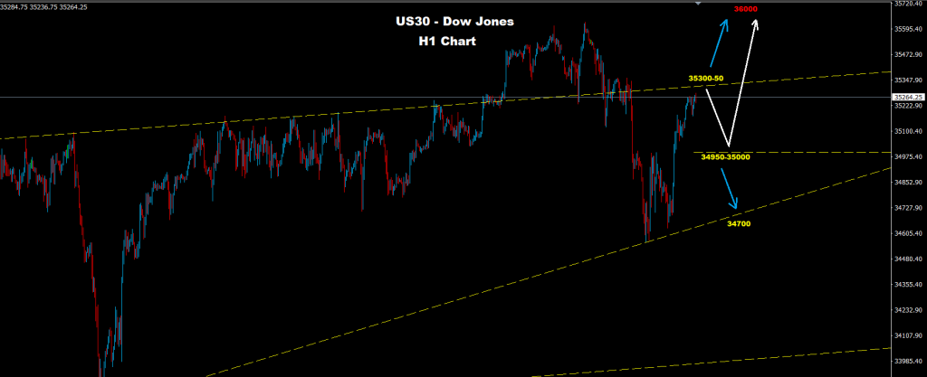بينما فوق 35350، فإن فرصة استمرار موجة الاتجاه الصاعد الحالية نحو 35600 وما فوق قد تستمر على الداو