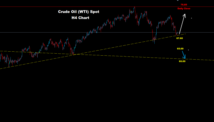 توجه النفط الخام لموجة انخفاض آخر حيث تمكن من إعادة اختبار مستويات الدعم للترند الصاعد حول مناطق 67.60