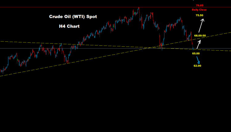 تمكن النفط الخام من إضافة المزيد من الانخفاض حيث تمكن من اختبار منطقة الدعم الثانية 65.00
