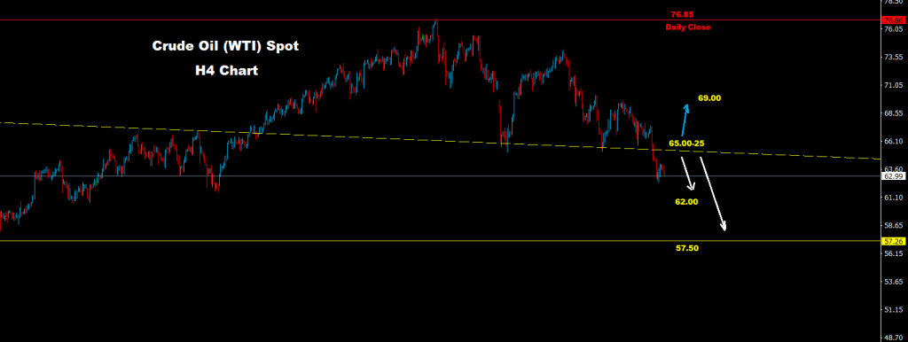 تمكن النفط الخام من اختراق مستوى الدعم 65.00 هذه المرة حيث نصحنا قبل ذلك أنه تحت هذا المستوى من المتوقع المزيد من الانخفاض نحو 62.00