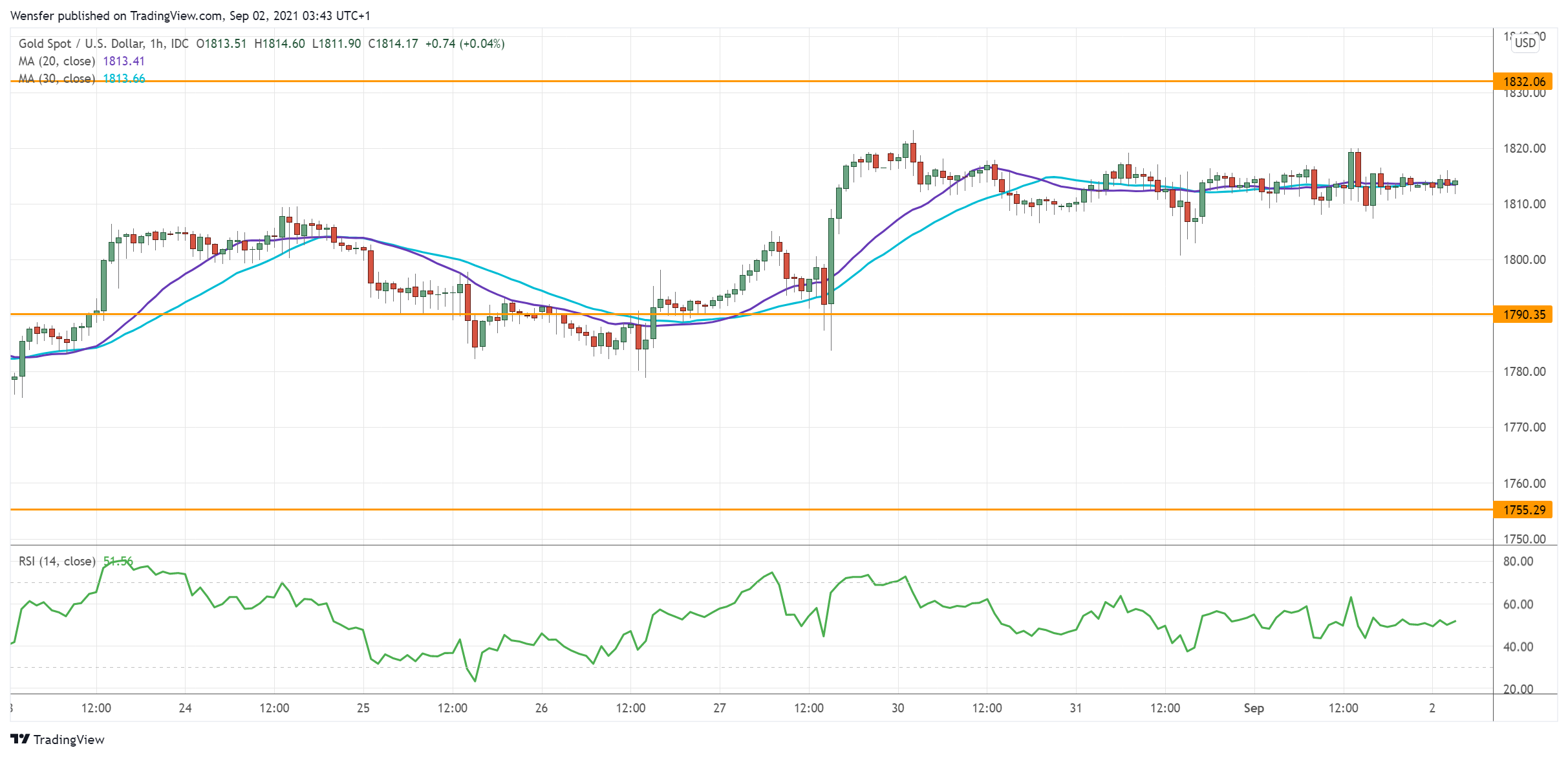ويفتش المتداولون عن الاتجاه بعدما استعاد المعدن معظم خسائره التي مني بها من عمليات البيع المكثفة في أغسطس. ويمثل المستوى ١٨٣٢ مستوى مقاومة رئيسي على الرسم البياني اليومي.