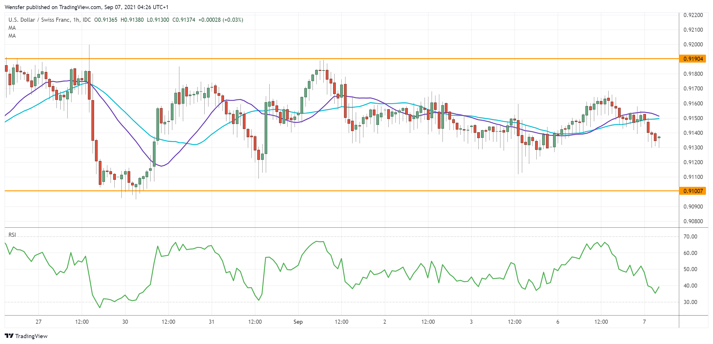 وقد يؤدي وجود مؤشر القوة النسبية بالقرب من منطقة ذروة البيع قرب النطاق السفلي إلى تحفيز بعض عمليات الشراء. كما أن الإغلاق أعلى ٠.٩١٩٠ يحتمل أن يؤدي إلى اختبار أعلى مستوى لشهر يوليو عند ٠.٩٢٧٠. أما الانخفاض إلى ما دون النطاق السفلي فقد يتسبب في إرسال السعر نحو الدعم اليومي عند ٠.٩٠٢٠، مما يعرّض حركة الارتداد للخطر في هذه المرحلة.