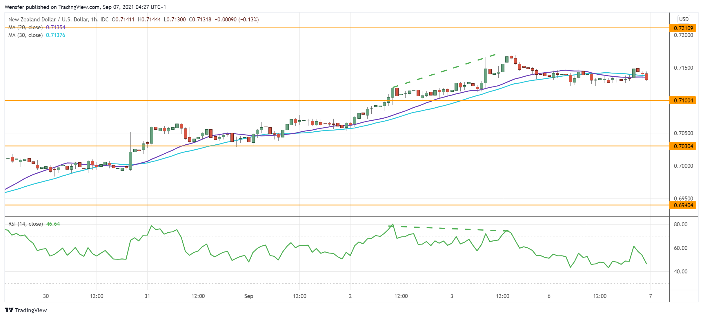 وقد ارتد المؤشر من منطقة الطلب قرب المستوى ٧١٢٥ والذي يقع في ٣٠ يوماً. وهو يدل على أن السيطرة على الحركة لا تزال في أيدي المشترين.