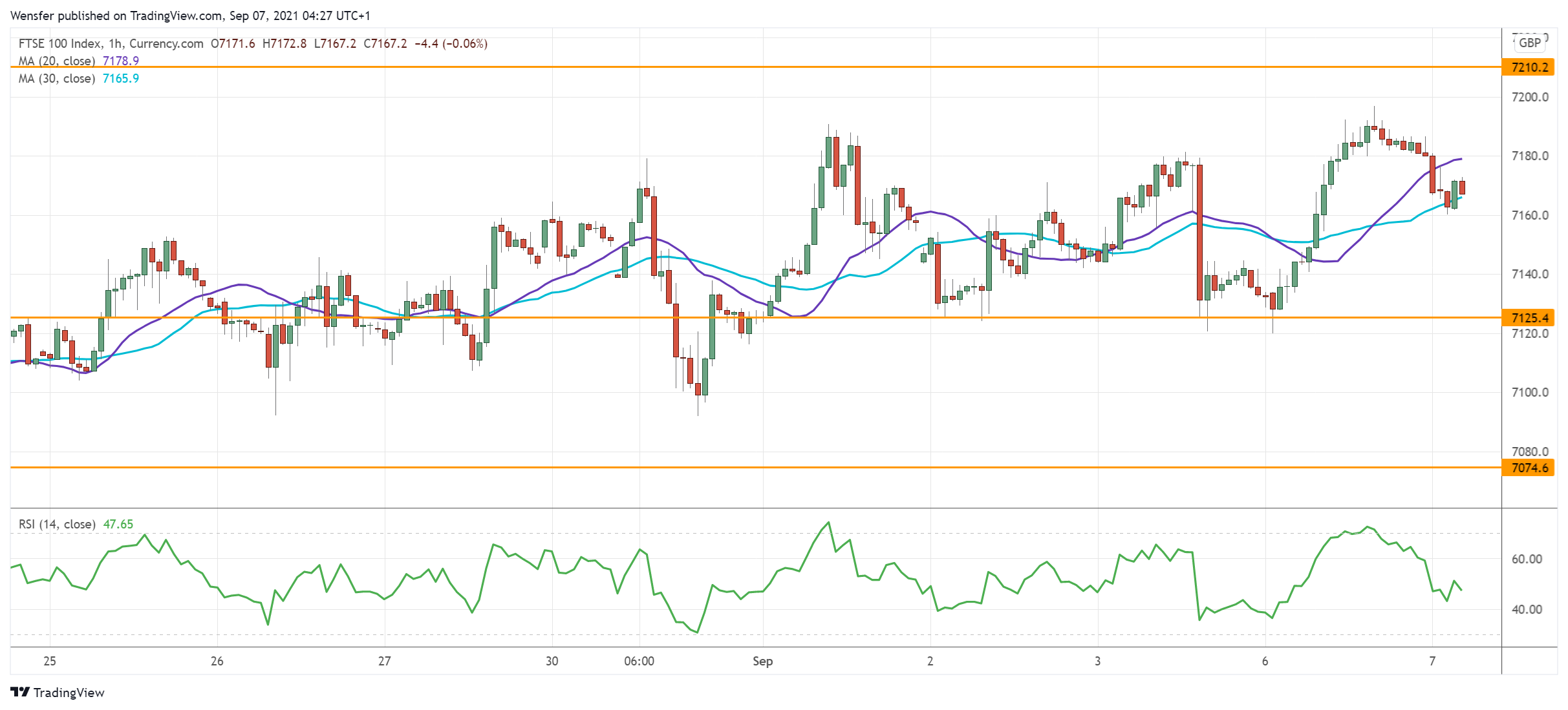 ويعد المستوى ٧٢١٠ هو الحاجز الرئيسي من عمليات البيع المكثفة التي حدثت في أغسطس، وقد يعيد اختراقه الارتفاع إلى المسار الصحيح. ومن ثم سيكون المستوى ٧٣٠٠ هو الهدف التالي. رغم إن وجود مؤشر القوة النسبية في منطقة ذروة الشراء قد يعيق التحيز الإيجابي مؤقتاً.