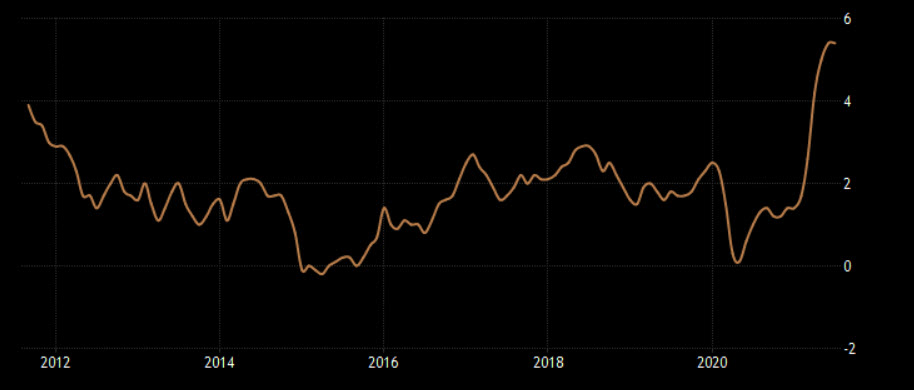 سجلت معدلات التضخم أعلى مستوياتها في 13 عام والتي قد تخطت نسبة 5%، ولكن الفيدرالي يرى أن تلك الارتفاعات ناتجة عن عوامل مؤقتة وقد تتباطأ وتيرة ارتفاع التضخم خلال الشهور المقبلة. ولكن إذا تباطأت وتيرة ارتفاع التضخم الشهري من 0.5% إلى 0.4% خلال أغسطس فهذا يعني تباطؤ وتيرة ارتفاع التضخم السنوي إلى 5.3%.